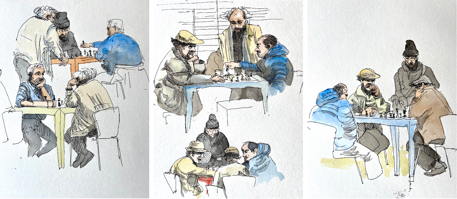 Dans le grand hall de la médiathèque se retrouvent les joueurs d’échec tous les après midis. A chaque fin de partie les joueurs du même groupe changent de partenaires. Ils bougent sans cesse mais si l’on patiente un peu on s’aperçoit que tôt ou tard ils reprennent la même pose qu’auparavant.