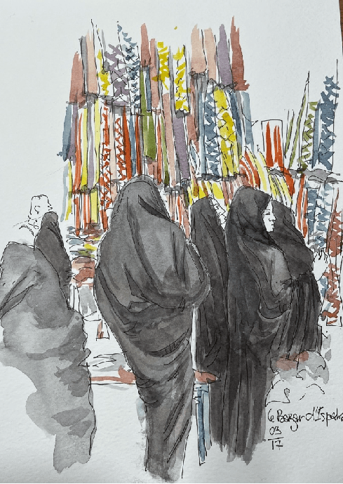 ISPAHAN – le bazar des tissus; Contraste entre le tchador noir et les couleurs pétillantes des tissus, les autres vêtements et notamment les plus intimes sont bien différents…