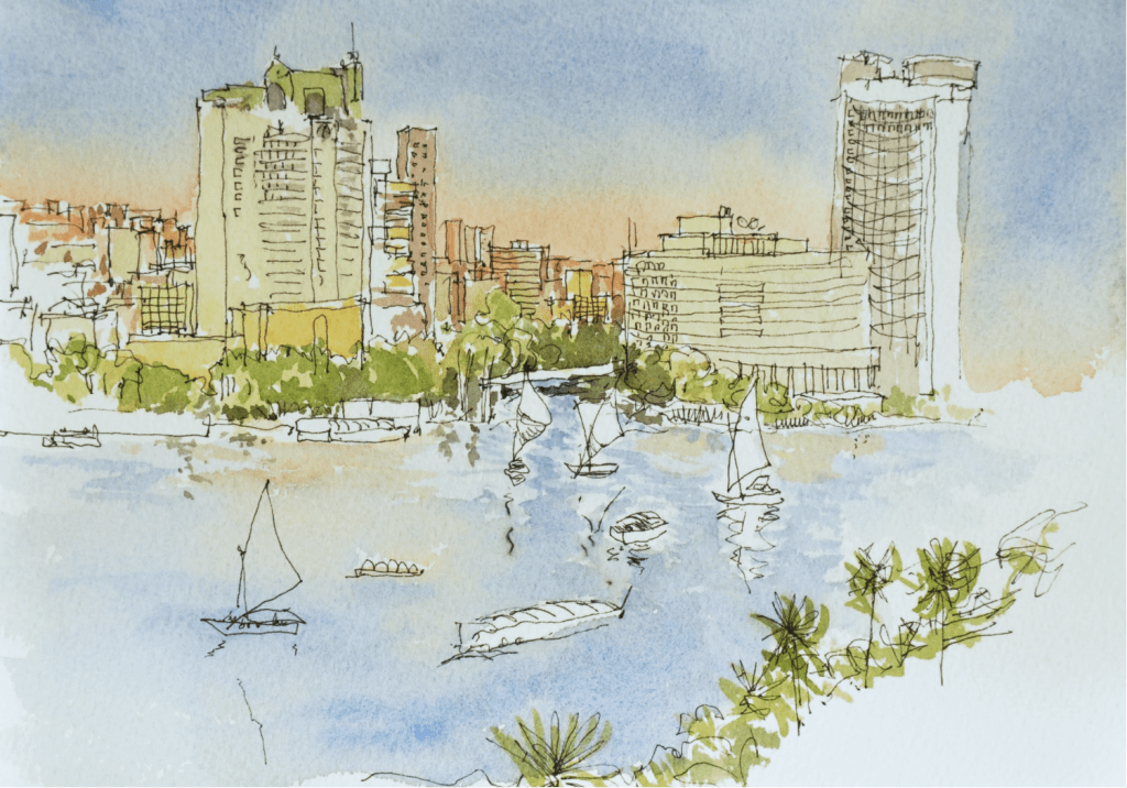 EGYPTE LE CAIRE – Les bords du Nil au centre du Caire : le pont principal arrive sur la place Tahrir et down town. Autour les principaux immeubles, quelques tours qui abritent sièges sociaux et hôtels internationaux pourraient donner l’impression d’une grande capitale moderne. Impression vite transformée dès que l’on se déplace dans l’épaisseur de la ville.