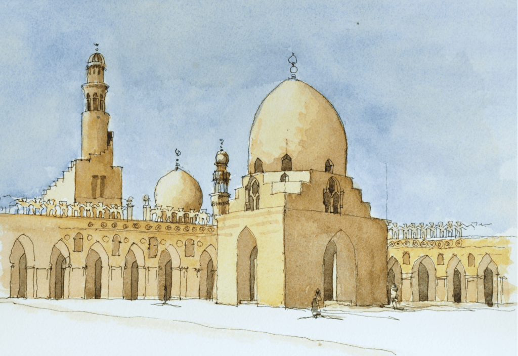 LE CAIRE La mosquée d’Ibn Tulun. Ce n’est pas la plus grande du Caire, ce n’est pas la plus décorée mais c’est un ensemble architectural parfait. La gigantesque cour intérieure donne une impression de grande tranquillité au milieu d’un quartier assourdissant de mouvements. Les gardiens sont accueillants surtout lorsqu’on dessine leur mosquée assis par terre avec les pantoufles qu’ils prêtent aux visiteurs.