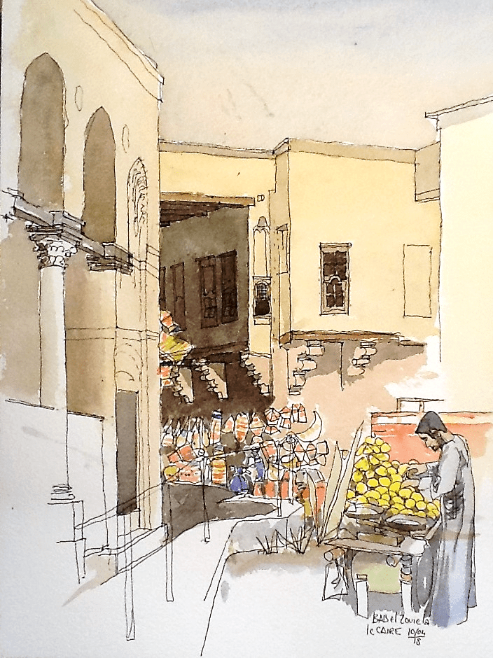 LE CAIRE – Près de BAB el Zouila. Vers la porte sud du rempart historique, la rue est un marché à ciel ouvert et une portion de la rue est aussi couverte. Beaucoup de marchands de lanternes au Caire mais aussi des petites charrettes partout comme celle de ce vendeur de mangues.