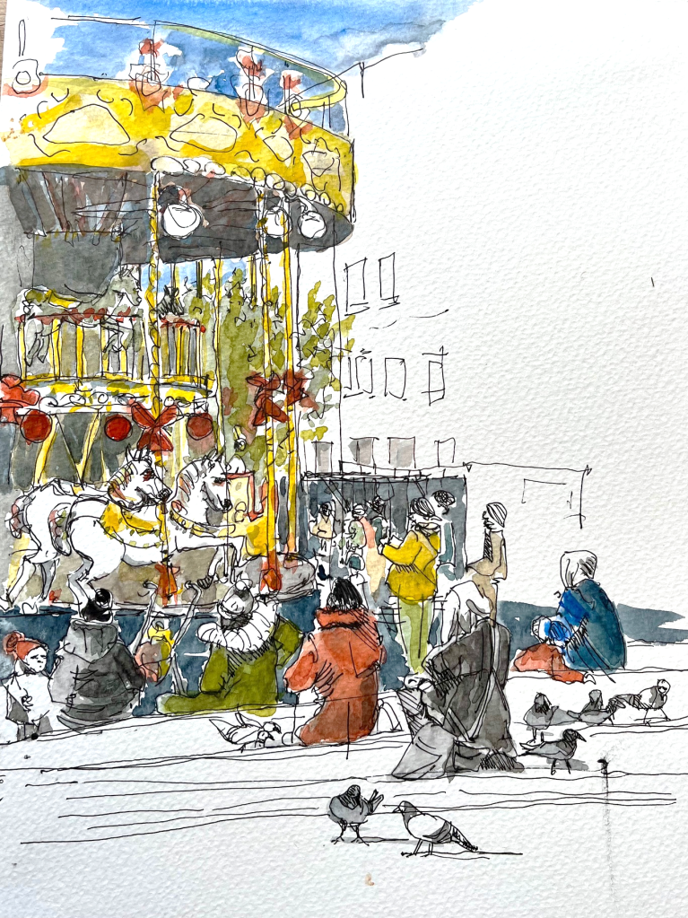 POITIERS – avec le groupe local des Urban Sketcheurs.À la veille de Noel, la place Leclerc se couvre de chalets et d’animations. Un vieux manège.